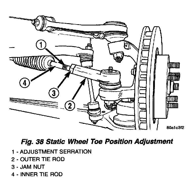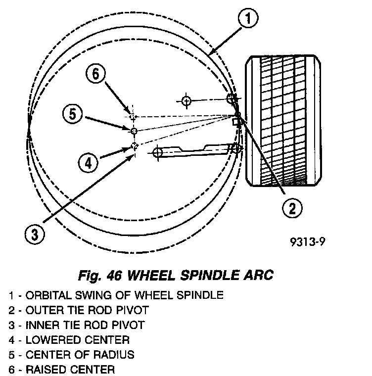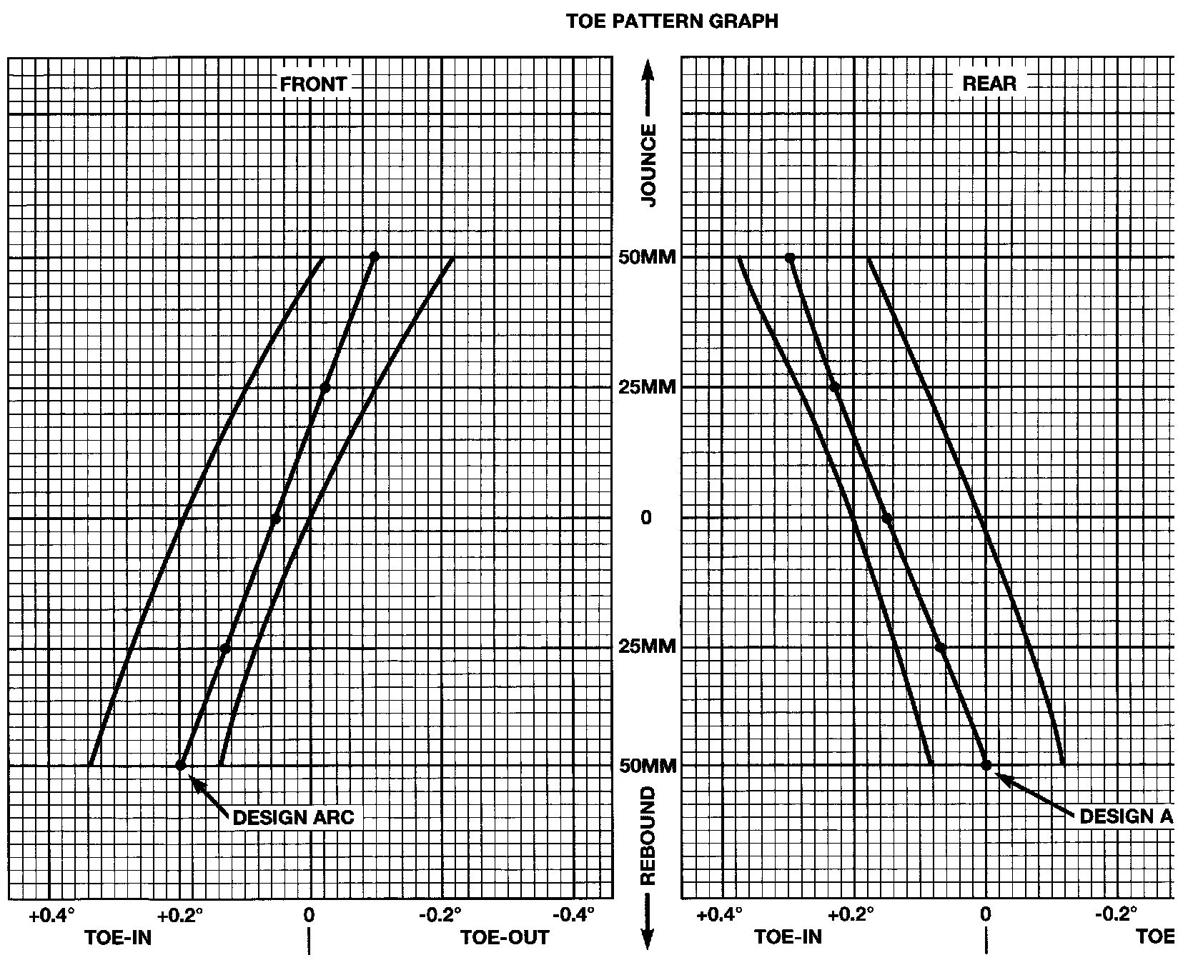 On the front of the vehicle, the tie rods are located in front of the spindles. If the steering gear is raised, toe-in will increase on rebound and toe-out will increase on jounce. If the steering gear is lowered, the opposite would occur. The front toe pattern should arc from (-)0.10°; toe-out at 50 mm (2 inch) jounce to (+)0.20°; toe-in at 50 mm (2 inch) rebound.