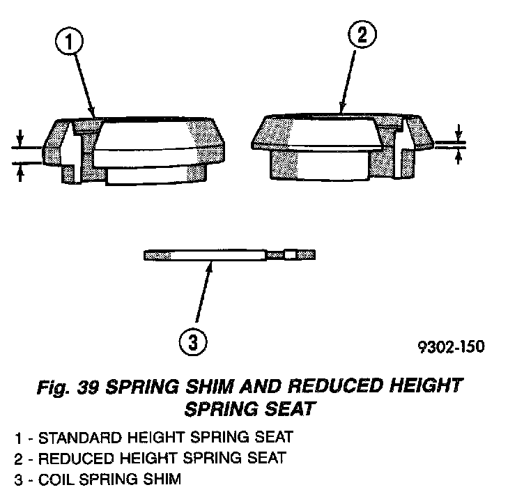 On vehicles with the standard suspension, spring shims or reduced height seats may be installed on the front or rear shock assemblies. Spring shim installation increases coil spring preload, thus raising the curb height of the vehicle. Reduced spring seat installation decreases coil spring preload, thus lowering the curb height of the vehicle.
