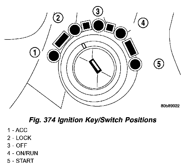 Refer to the chart that expected shifter response, depending on ignition key/switch (Fig. 374) and brake pedal positions.