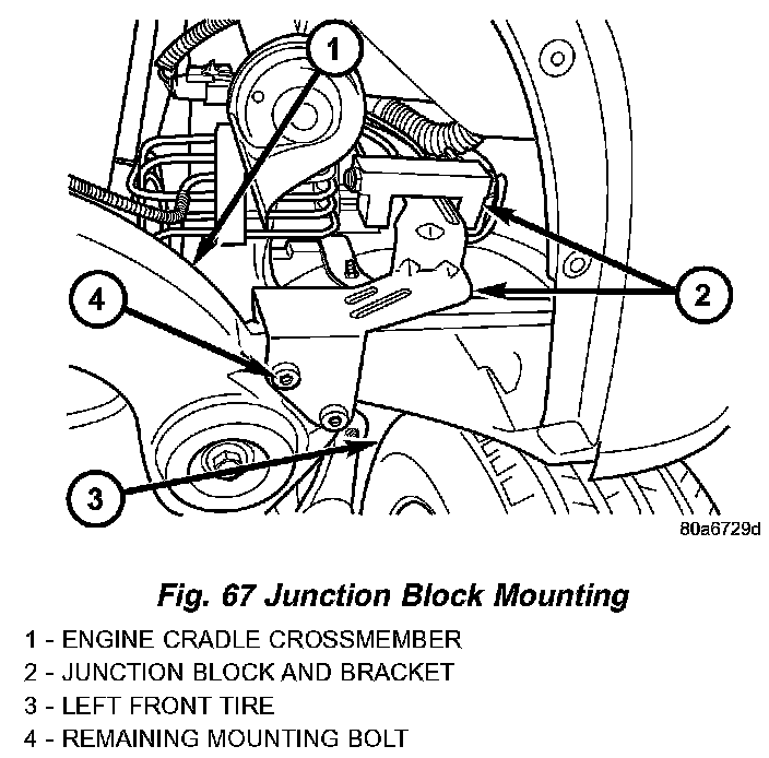 A junction block is used on vehicles that are not equipped with Antilock Brakes (ABS). The junction block is located in front of the driver's side front tire behind the front fascia. The junction block mounts in the same location as the ABS Integrated Control Unit (ICU) does on vehicles with ABS.
