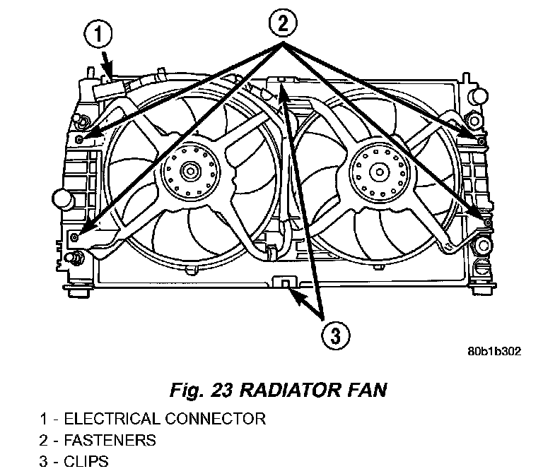 DESCRIPTIONThe radiator fan assembly includes two electric motors, a motor support, and an one piece shroud. The assembly is fastened to the radiator by screws with square nuts and retaining clips.
