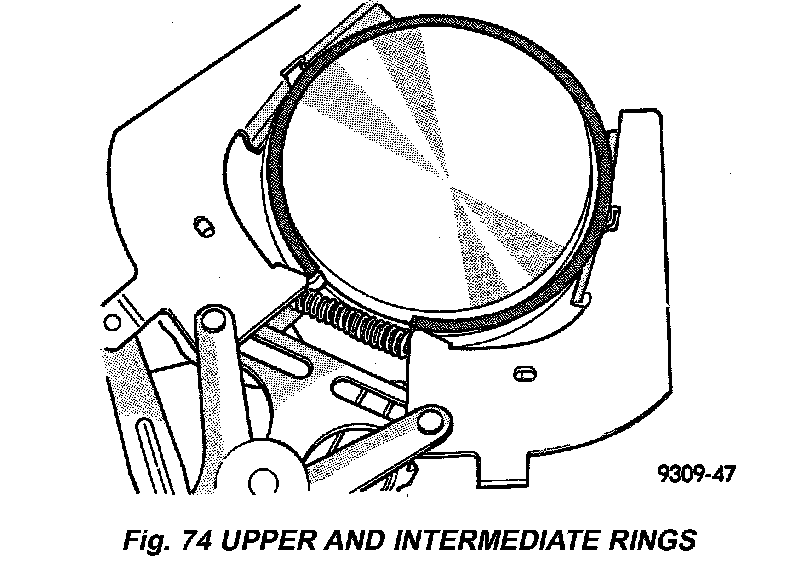 2. The No. 1 and No. 2 piston rings have a different cross section. Ensure No. 2 ring is installed with manufacturers I.D. mark (dot) facing up, towards top of the piston (Fig. 72).