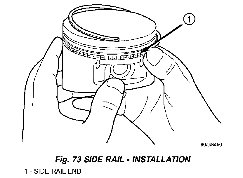 8. Install the side rail by placing one end between the piston ring groove and the expander. Hold end firmly and press down the portion to be installed until side rail is in position. Do not use a piston ring expander during this step (Fig. 73).
