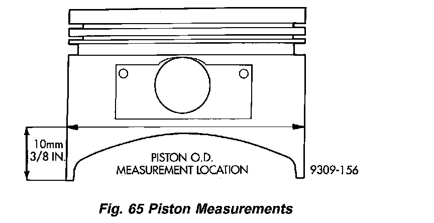 Piston and cylinder wall must be clean and dry. Piston diameter should be measured 90 degrees to piston pin at size location shown in (Fig. 65). Cylinder bores should be measured halfway down the cylinder bore and transverse to the engine crankshaft center line. Refer to Specifications. Pistons and cylinder bores should be measured at normal room temperature, 70 °F (21 °C).
