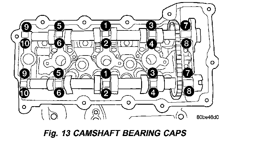 10. Remove camshaft bearing caps gradually in REVERSE sequence of installation (10-1) (Fig. 13).