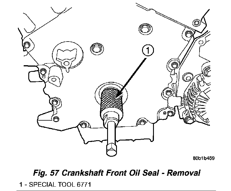 2. Install Special Tool 8194, Insert into crankshaft nose. Remove seal using Special Tool 6771, Remover (Fig. 57).