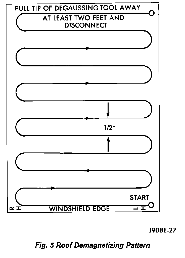 8. Slowly approach the center line of the roof panel at the windshield header, with the degaussing tool connected.