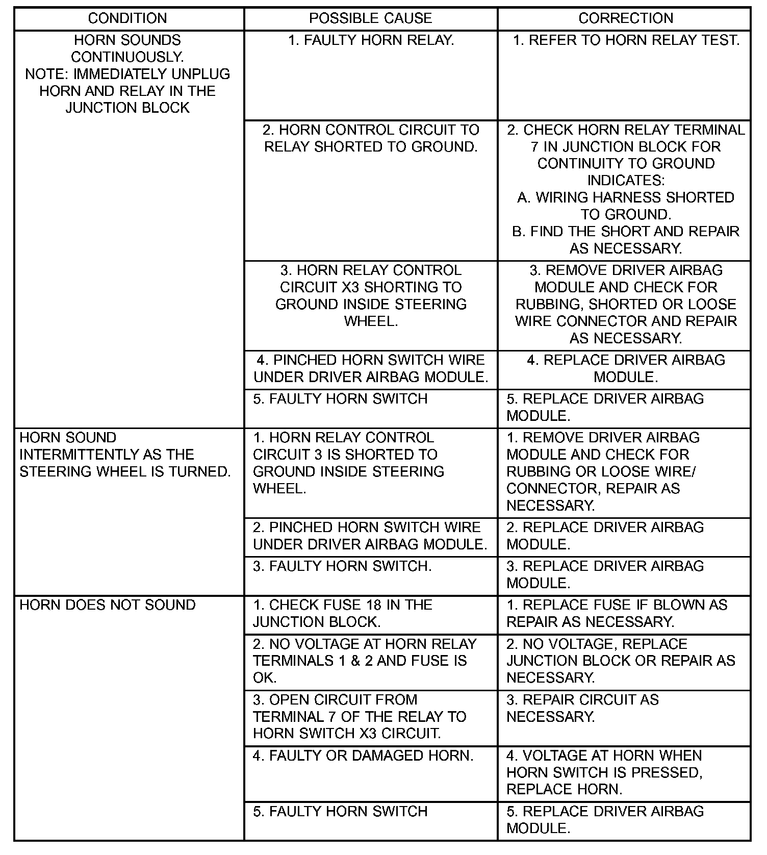 Check fuse 18 in the Junction Block and fuse L in the Power Distribution Center. Refer to Horn System Test table.