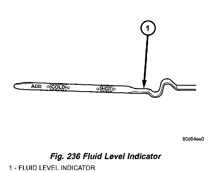 7. Check the transaxle fluid level and add an appropriate amount to bring the transaxle fluid level to 3 mm (1/8 inch) below the lowest mark on the dipstick (Fig. 236).