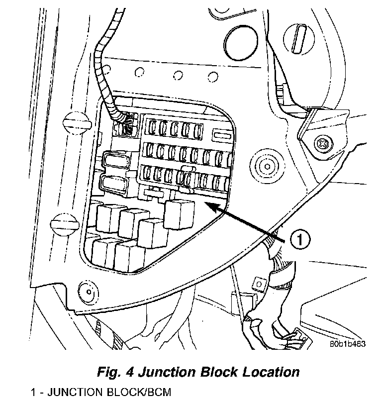 An electrical Junction Block (JB) is located in the left endcap of the instrument panel (Fig. 4). The JB combines the functions previously provided by a separate fuseblock module and relay center. It also serves to simplify and centralize numerous electrical components, as well as to distribute electrical current to many of the accessory systems in the vehicle. It eliminates the need for numerous splice connections and serves in place of a bulkhead connector between many of the engine compartment, instrument panel, and body wire harnesses.