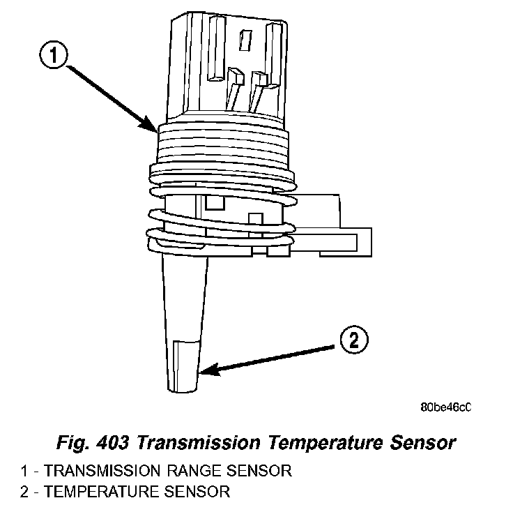 The TRS has an integrated thermistor (Fig. 403) that the PCM uses to monitor the transmission's sump temperature. Since fluid temperature can affect transmission shift quality and convertor lock up, the PCM requires this information to determine which shift schedule to operate in. The PCM also monitors this temperature data so it can energize the vehicle cooling fan(s) when a transmission "overheat" condition exists. If the thermistor circuit fails, the PCM will revert to calculated oil temperature usage.