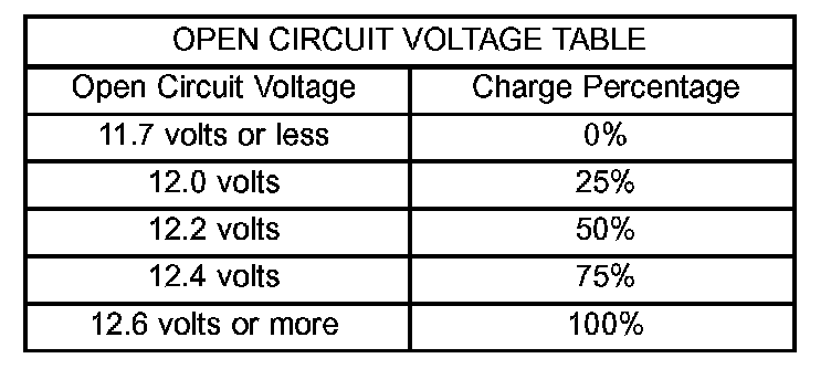 See the Open-Circuit Voltage Table. This voltage reading will indicate the battery state-of-charge, but will not reveal its cranking capacity. If a battery has an open-circuit voltage reading of 12.4 volts or greater, it may be load tested to reveal its cranking capacity (Refer to ELECTRICAL/BATTERY SYSTEM/BATTERY - STANDARD PROCEDURE).
