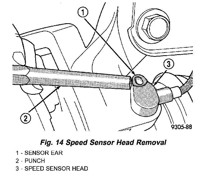 6. Carefully, remove sensor head from steering knuckle. If the sensor has seized, due to corrosion, DO NOT USE PLIERS ON SENSOR HEAD. Use a hammer and punch to tap edge of sensor ear, rocking sensor side to side until free.