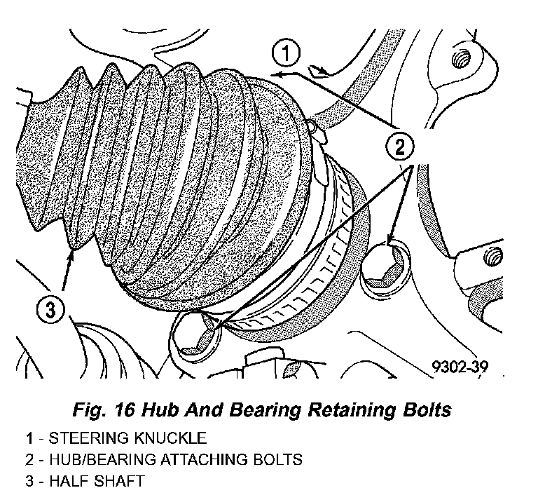 8. Remove the 3 steering knuckle to hub and bearing assembly attaching bolts.