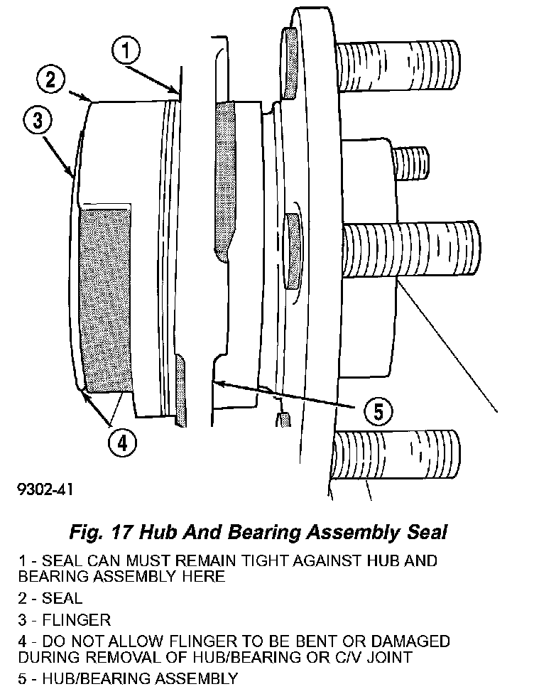 CAUTION: If metal seal on hub and bearing assembly is seized to steering knuckle and becomes dislodged on hub and bearing assembly during bearing removal the hub and bearing assembly MUST not be reused and MUST be replaced with a new hub and bearing assembly. Also if flinger disc becomes damaged (bent or dented) during removal, hub and bearing assembly must be replaced with a new hub and bearing assembly.