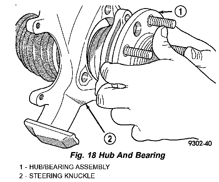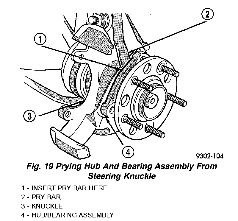 9. Remove hub and bearing assembly from steering knuckle. It is removed by sliding it straight out of steering knuckle and off end of stub axle. If hub and bearing assembly will not slide out of knuckle, insert a pry bar between hub and bearing assembly and steering knuckleand gently pry hub and bearing from knuckle. If stub shaft is frozen to hub and bearing assembly tap end of stub shaft with soft face hammer to free it from hub and bearing spline.