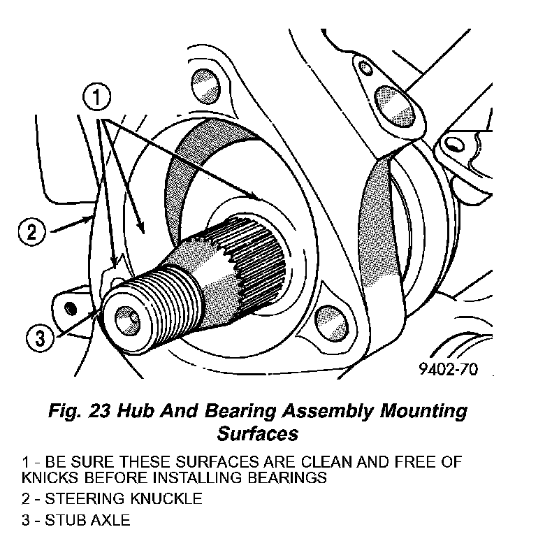 - Hub and bearing assembly mounting surfaces on steering knuckle and halfshaft must be smooth and completely free of foreign material or nicks.