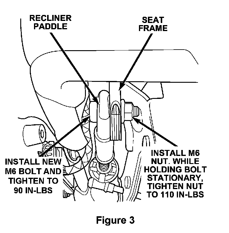 5. Using a "1/4" drive air ratchet and a T30 Torx bit, install one of the supplied bolts into the hole in the recliner paddle (Figure 3) and then into the hole in the seat back frame. Using an inch-pound torque wrench, tighten the bolt (without the nut attached) to 90 in-lbs (10.2 N.m).