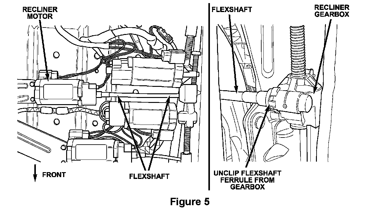 8. Remove the inboard recliner motor-to-gearbox flexshaft. To do this, remove the end of the flex shaft from the recliner motor while pulling on the flex shaft housing, slide the flex shaft out of its housing so that it disengages from the inboard recliner gearbox and then unclip the ferrule from the gearbox (Figure 5). Discard the flex shaft.