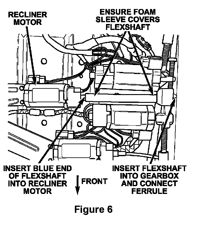 9. Ensure that the foam sleeve is positioned on the provided flexshaft and then install the flexshaft. To do this, insert the BLUE end of flex shaft into the recliner motor, attach the supplied ferrule/clip to the other end of the flex shaft and then connect it to the inboard gearbox (Figure 6).