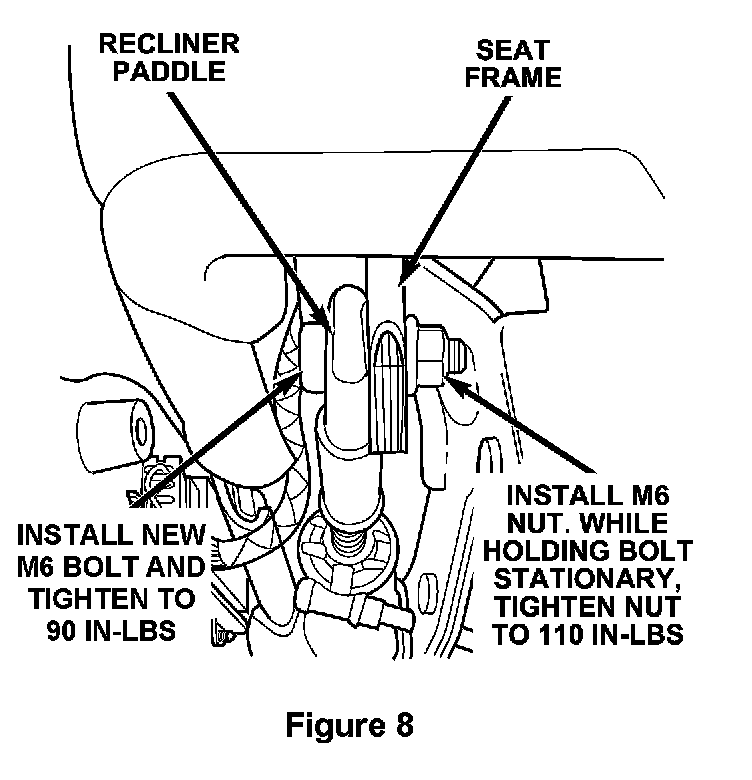 12. Install one of the supplied bolts into the hole in the outboard recliner paddle (Figure 8) and then into the hole in the seat back frame. Tighten the bolt (without the nut attached) to 90 in-lbs (10.2 N.m).