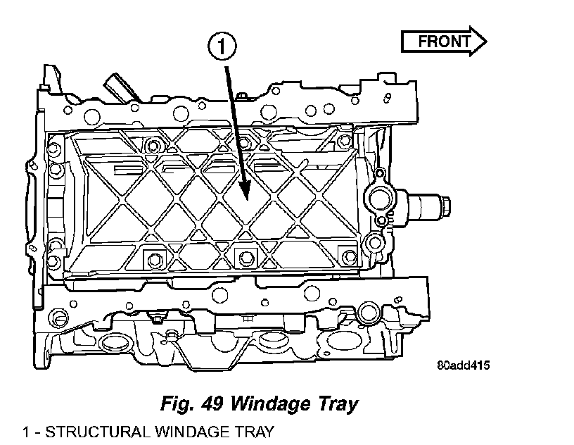 10. Install windage tray (Fig. 49). Lubricate bolts with engine oil and tighten to 27 Nm + 1/4 Turn (20 ft. lbs. + 1/4 turn).