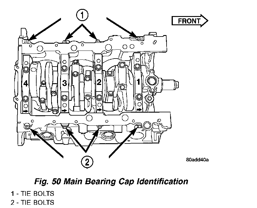 11. Install the main cap tie (horizontal) bolts and tighten to 28 Nm (250 in. lbs.) (Fig. 50).