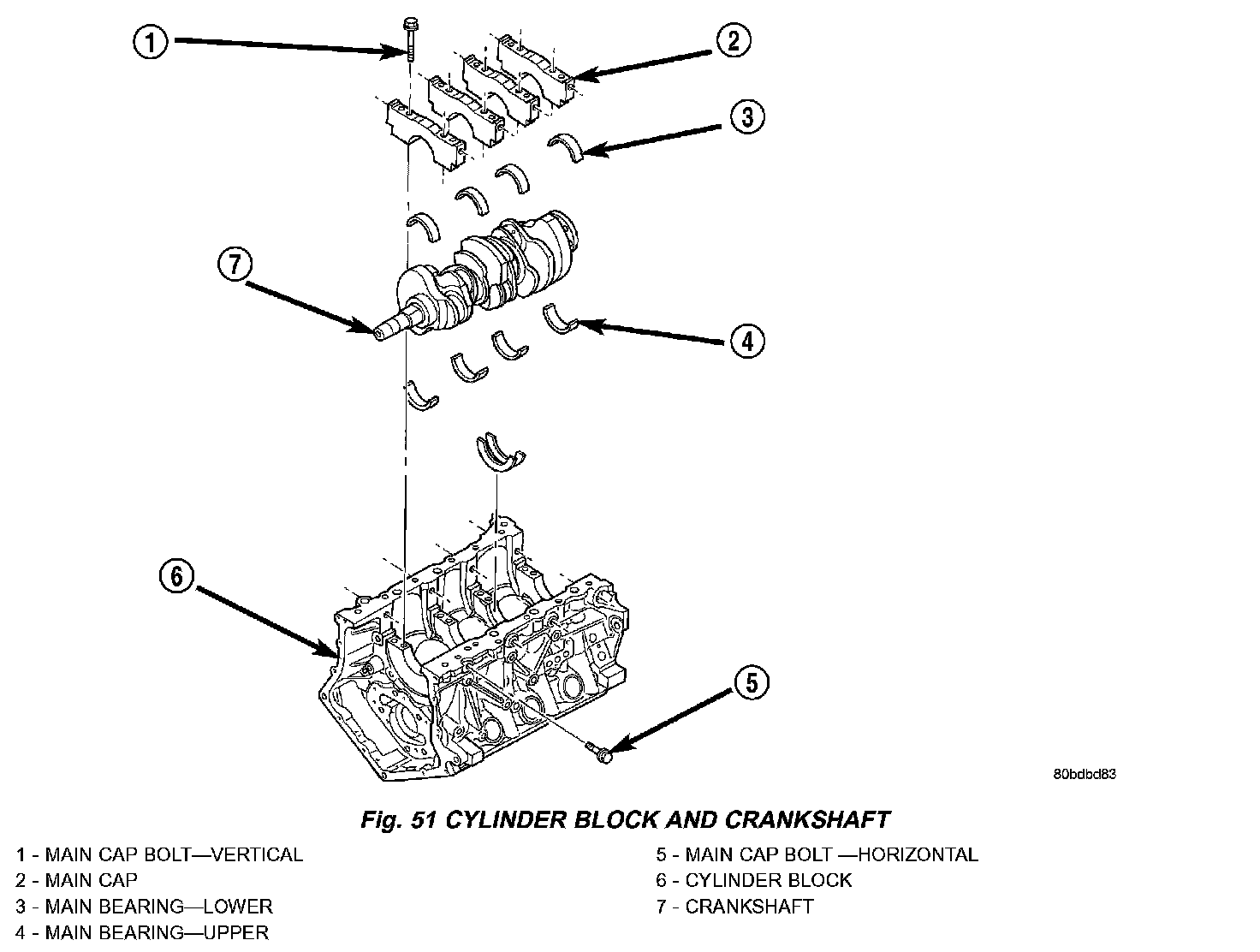 The main bearing cap bolts must be tightened in the proper sequence. First the inner main cap bolts, secondly the windage tray bolts, and lastly the main cap tie (horizontal) bolts.