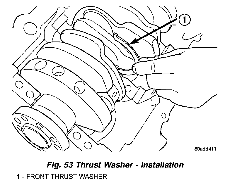 3. Push crankshaft forward. Lubricate and install the front thrust washer by rolling the thrust washer onto the machined shelf between the No. 3 upper main bulk head and crankshaft thrust surface (Fig. 53).