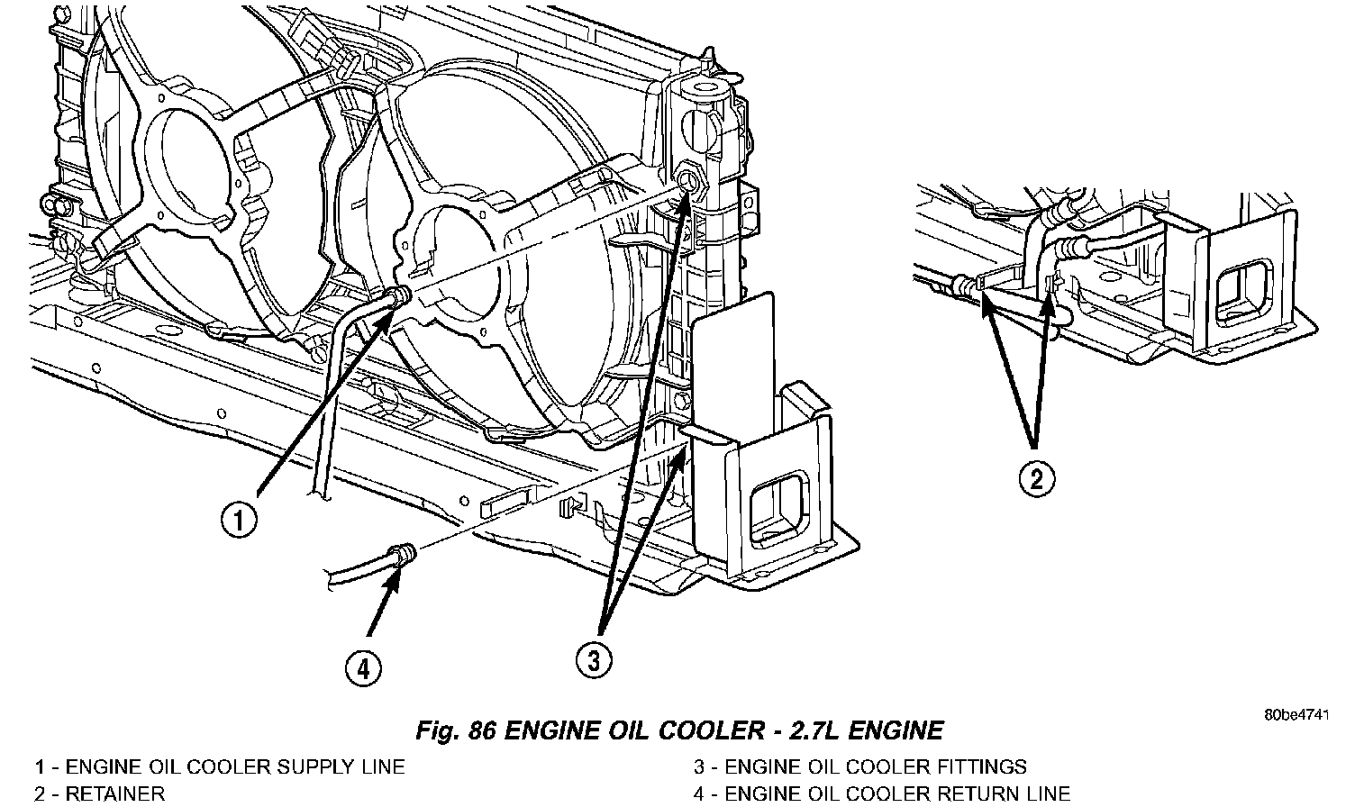 DESCRIPTIONVehicles equipped with the Heavy Duty Cooling option (Sales Code NMC) use an engine oil cooler that is mounted inside the right radiator tank (Fig. 86). Oil lines connect the cooler to the engine.