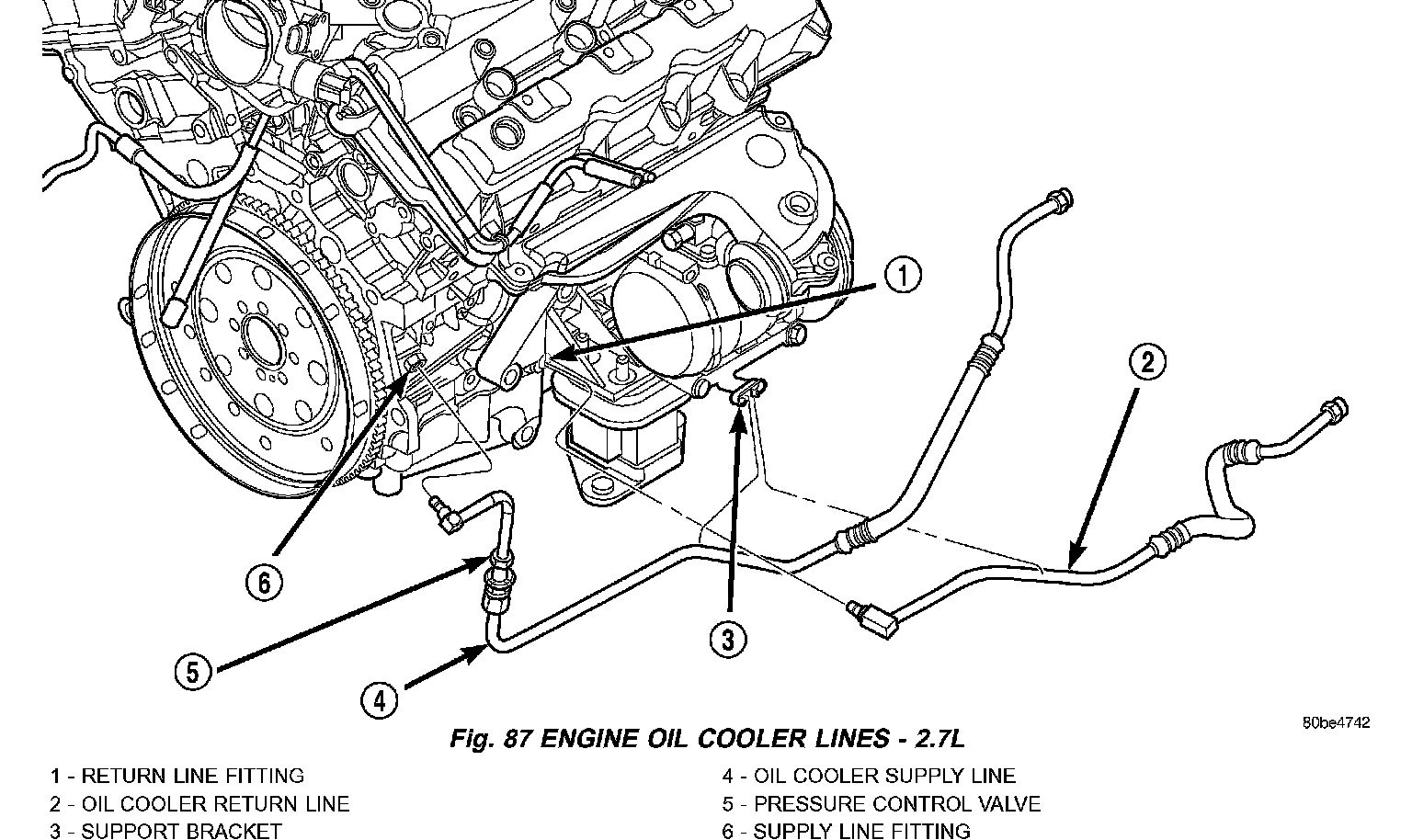 Engine oil travels from the engine through the supply line and into the cooler. The supply line is connected to a control valve that allows engine oil flow when pressure is above 138 - 207 kPa (20 - 30 psi) and an internal orifice limits oil flow to a maximum of 11.3 LPM (3 GPM). The engine oil exits the cooler through the oil return line and is returned to the engine oil pan (Fig. 87).