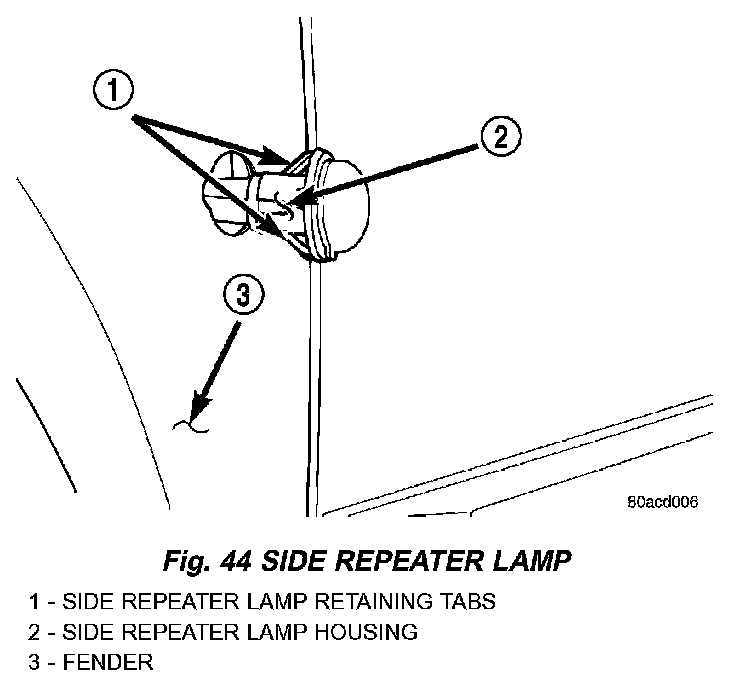 One Side Repeater Lamp can be found on each side of the vehicle just behind the front wheel (Fig. 44). The side repeater lamp utilizes an amber colored housing and clear bulb.