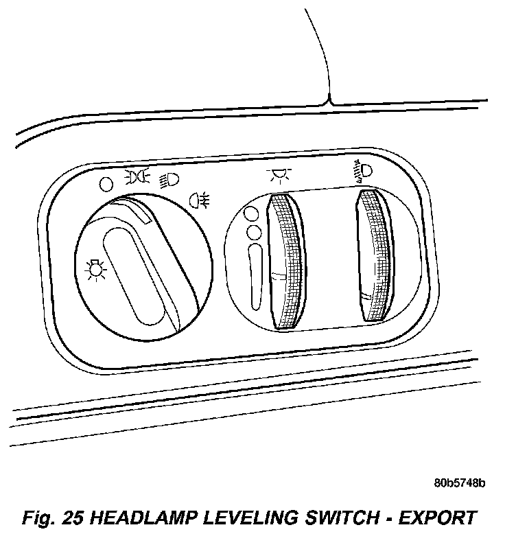 The Headlamp Leveling Switch is located next to the headlamp switch (Fig 25) and is the primary controller of the headlamp leveling system. The leveling switch has three settings 0-2, "0" being the lowest, "2" being the highest headlight beam vertical setting.