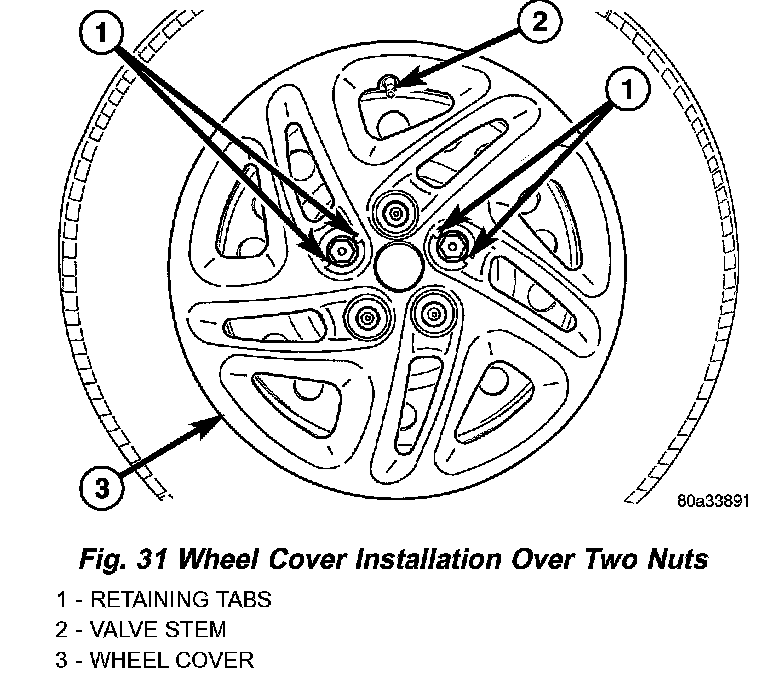 c. Press in on center of wheel cover until wheel cover retaining tabs push past and engage rear of previously installed wheel mounting nuts. This will hold the wheel cover in place.