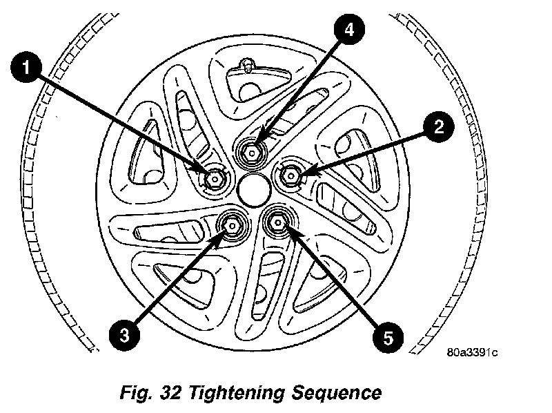 3. Tighten all five wheel mounting nuts in the proper sequence. Tighten wheel nuts to a torque of 135 Nm (100 ft. lbs.).