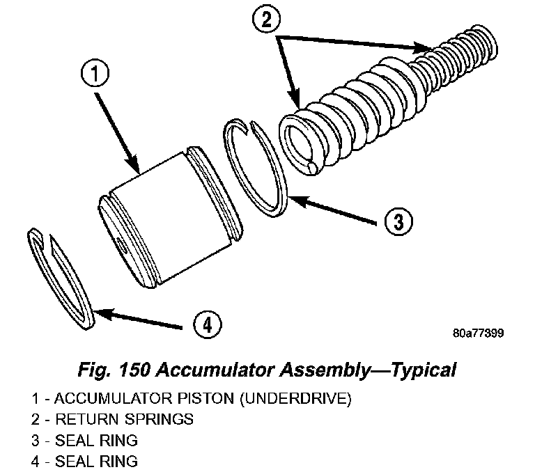 The 42LE underdrive, overdrive, low/reverse, and 2/4 clutch hydraulic circuits each contain an accumulator. An accumulator assembly typically consists of a piston, seals, return spring(s), and a cover or plug (Fig. 150).