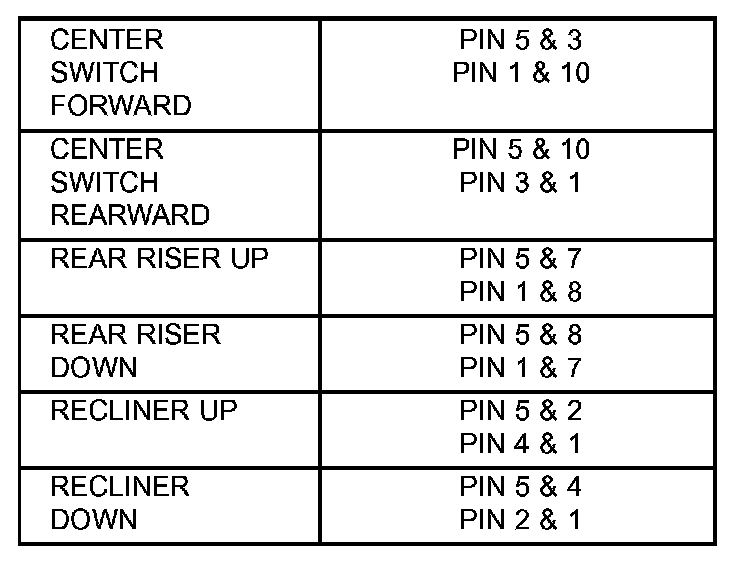4. Using an ohmmeter, verify the Seat Switch Continuity Test table, using the seat switch connector. If there is no continuity at any of the switch positions, replace the power seat switch.