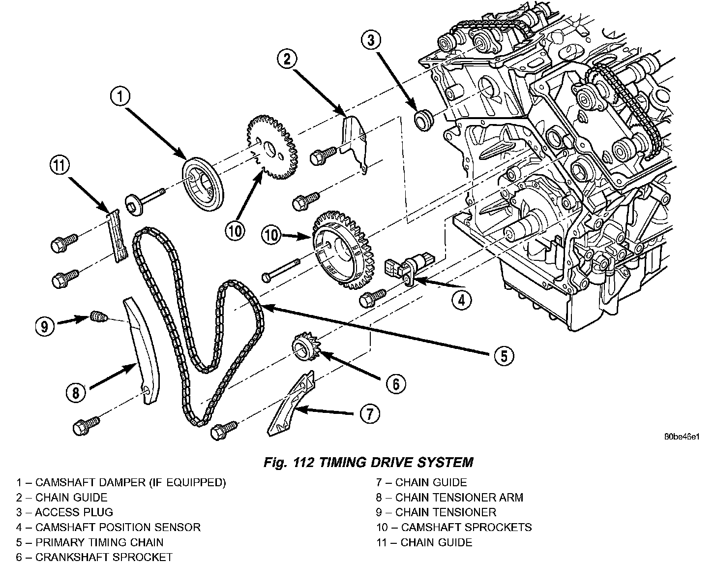 The primary timing chain drive (Fig. 112) uses a single, double-flexure, inverted tooth type chain. The primary chain drives both of the intake camshafts directly from a sprocket mounted on the crankshaft. In addition, the water pump is driven by the "back side" of the primary chain, necessitating the double flexure type chain.