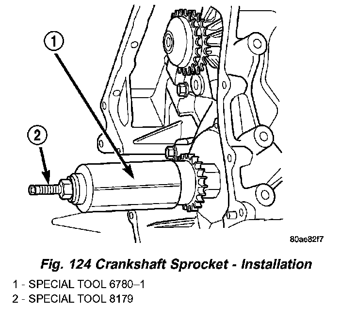 INSTALLATION - CRANKSHAFT SPROCKET1. Install crankshaft sprocket using Special Tools 6780-1 and 8179 (Fig. 124) until sprocket bottoms against crankshaft step flange. Use care not to rotate crankshaft.
