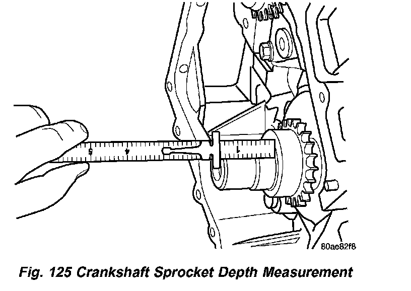 2. Verify that crankshaft sprocket is installed to proper depth by measuring from sprocket outer face to end of crankshaft (Fig. 125). Measurement should read: 39.05 ± 0.50 mm (1.5374 ± 0.020 inch).
