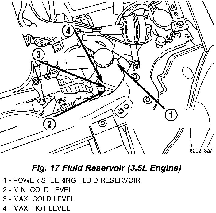 Wipe off the power steering fluid reservoir so that it is free of dirt. Check the fill level of the fluid in the reservoir according to the markings on the side of the reservoir. Measure the MAX. COLD/MIN. COLD fluid levels when the fluid is at normal ambient temperature, approximately 32 - 43 °C (90 - 110 °F). Add fluid as necessary and do not overfill. Use only Mopar ATF+4 Automatic Transmission Fluid in this power steering system.
