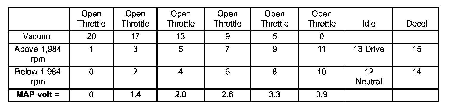 The number of cells varies upon the driving conditions. Two cells are used only during idle, based upon TPS and Park/Neutral switch inputs. There may be two other cells used for deceleration, based on TPS, engine rpm, and vehicle speed. The other twelve cells represent a manifold pressure and an rpm range. Six of the cells are high rpm and the other six are low rpm. Each of these cells is a specific MAP voltage range Typical Adaptive Memory Fuel Cells.