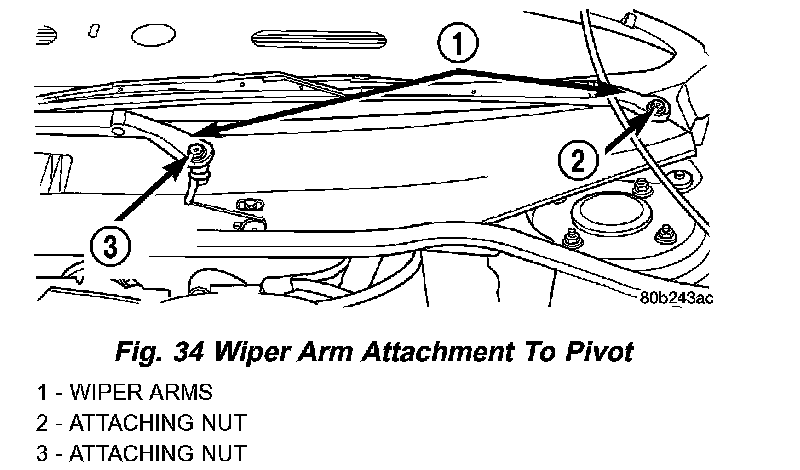 2. Remove caps from both wiper arms at the attachment to the pivots to expose the wiper arm attaching nut. Remove the nut attaching each wiper arm to its pivot.