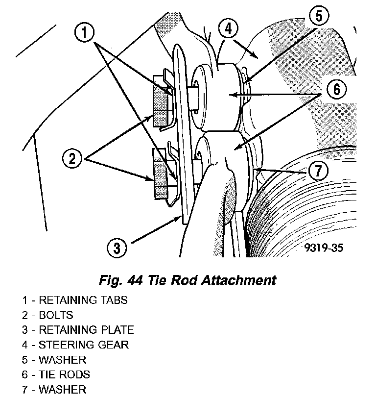 12. Bend back the retaining tabs on the mounting plate for the tie rod to steering gear mounting bolts.