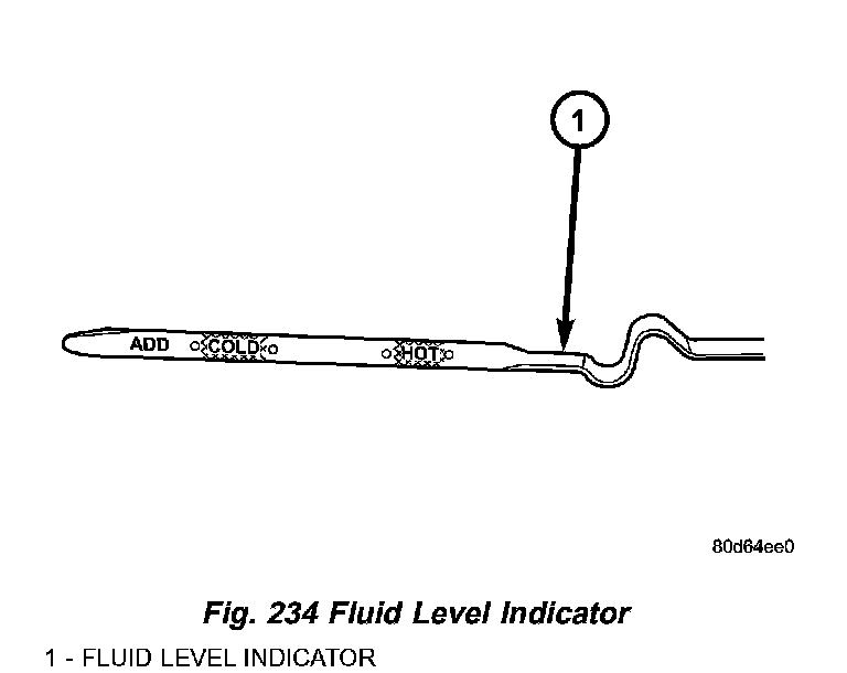 The torque converter fills in both the P Park and N Neutral positions. Place the selector lever in P Park to be sure that the fluid level check is accurate. The engine should be running at idle speed for at least one minute, with the vehicle on level ground. At normal operating temperature (approximately 82°C. or 180°F.), the fluid level is correct if it is in the HOT region (cross-hatched area) on the oil level indicator (Fig. 234). The fluid level should be in COLD region at 80' F fluid temperature. Adjust fluid level as necessary. Use only Mopar ATF +4 (Automatic Transmission Fluid-Type 9602).