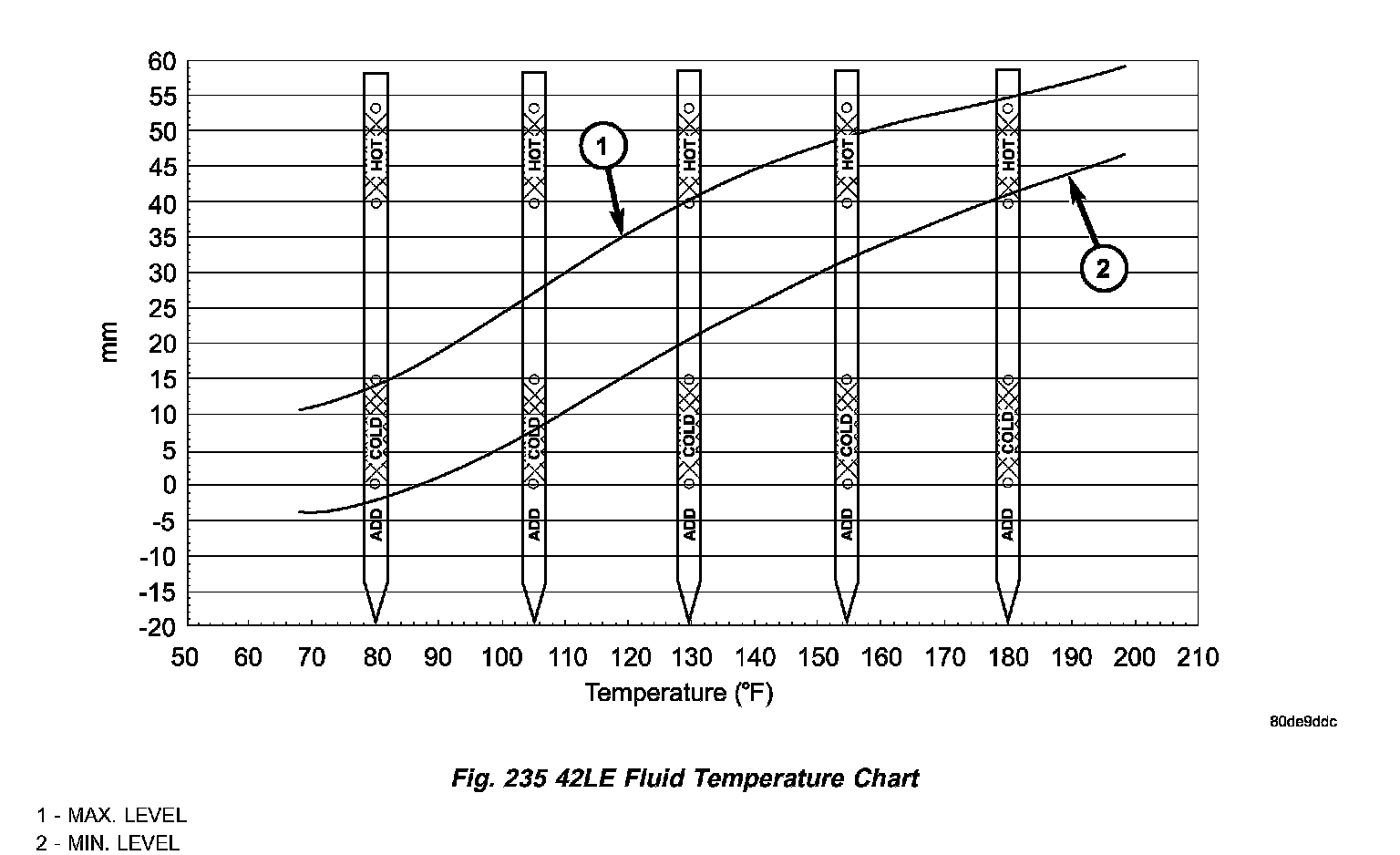 6. Adjust transmission fluid level shown on the dipstick according to the chart (Fig. 235). Use only Mopar ATF +4 Automatic Transmission Fluid (MS 9602).