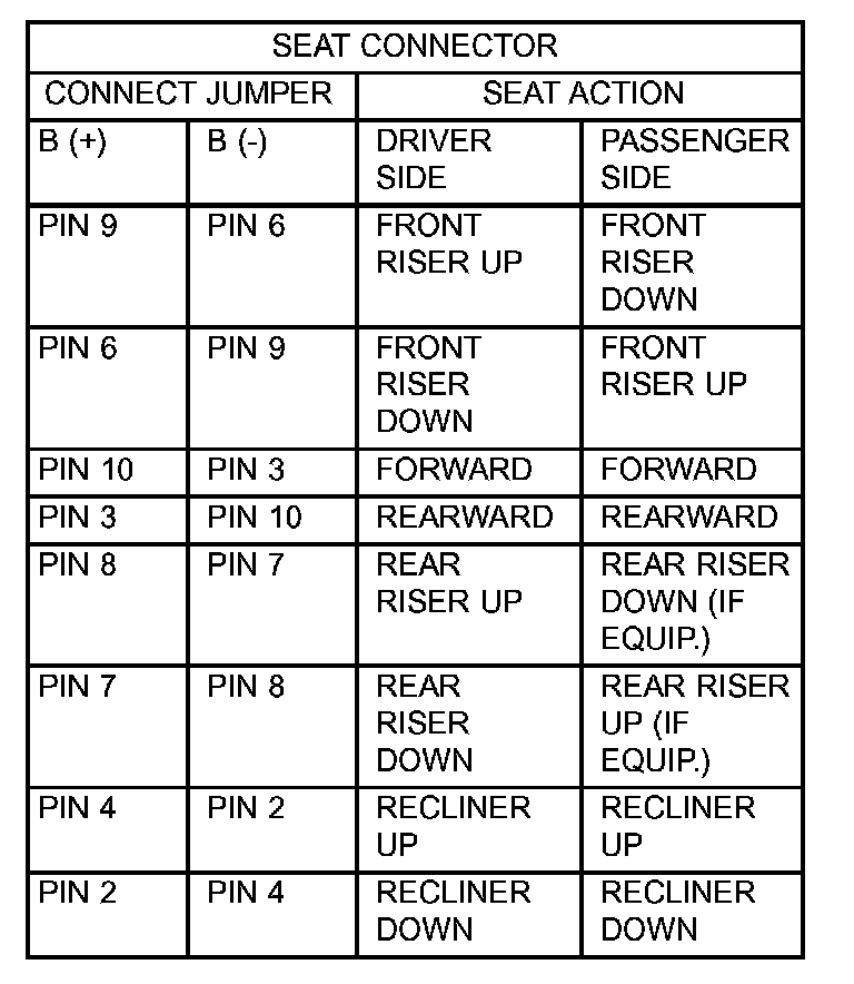 4. To test the seat motors and verify proper seat responses, refer to the Seat Motor Test table. Using two jumper wires, connect one to a battery supply and the second to a ground. Connect the other ends to the seat wire harness connector as described in the Seat Motor Test table.