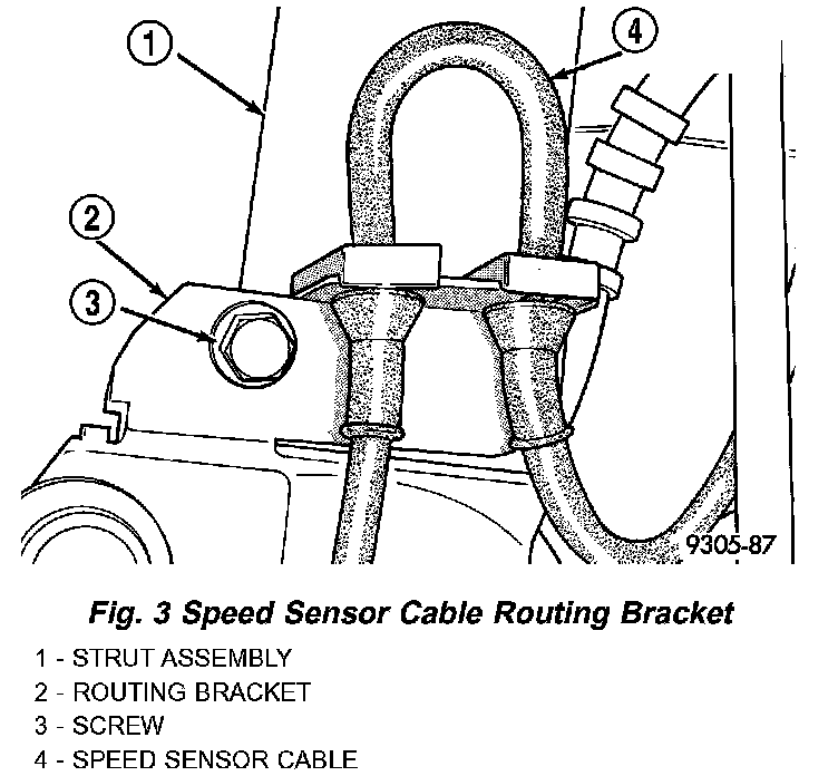 CAUTION: When installing the wheel speed sensor cable routing bracket on the strut, the speed sensor cable must be looped upward as shown. If speed sensor cable is not routed in this direction it may rub, damaging the speed sensor cable.