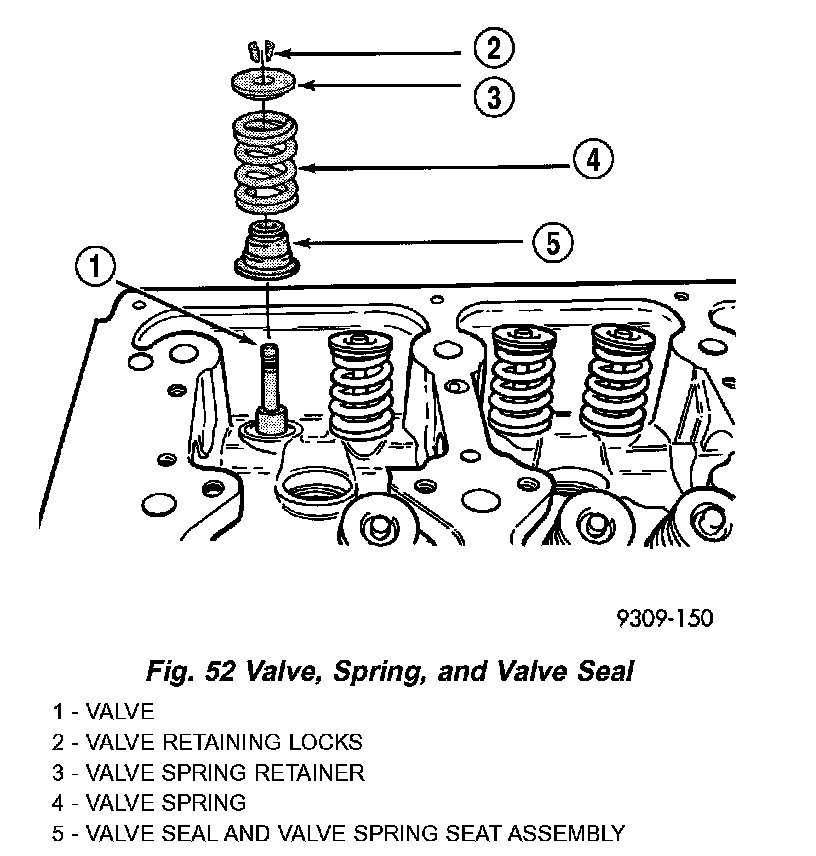 2. Install valve stem seal/spring seat assembly over valve guides on all valve stems (Fig. 52). Ensure that the garter spring is intact around the top of the rubber seal.