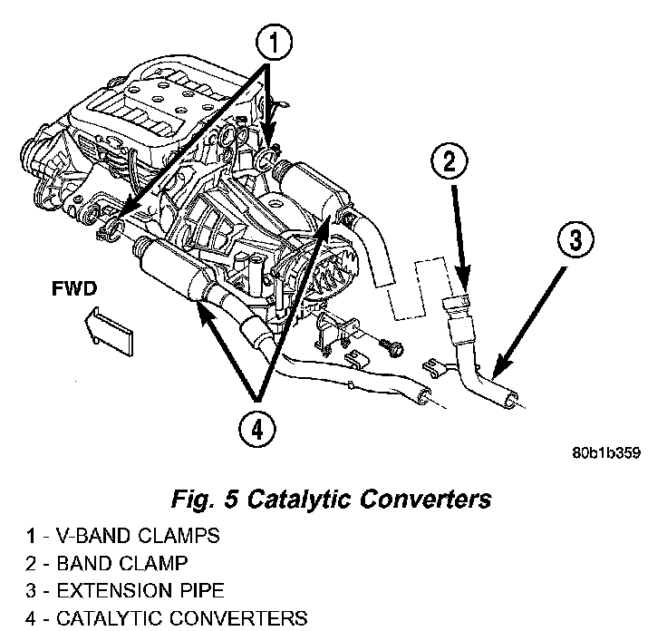 The close coupled, three-way catalytic converter inlets are connected to the exhaust manifolds by the use of V-Band clamps. The left side converter outlet pipe connects to the exhaust system. The right side converter connects to an extension pipe.